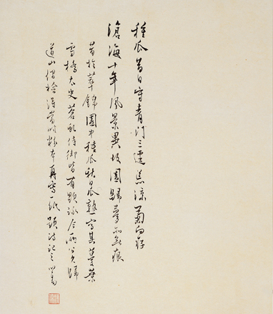 一般畫家作瓜圖,多半著意於「瓜瓞綿綿」的吉祥意象。溥心畬自題此畫粉本,是年少時在恭王府萃錦園中種瓜,秋日瓜熟所寫。題詩首句敘秦東陵侯召平於秦忘後,因家貧在長安東南之「青門」外種瓜的典故;次句用晉陶淵明<歸去來兮辭>:「三逕就荒,松菊猶存」意象,寫家園荒蕪。「舊王孫」悲涼的身世和遭遇,對故國、家園、舊友的懷念,在此圖中表露無遺。