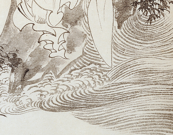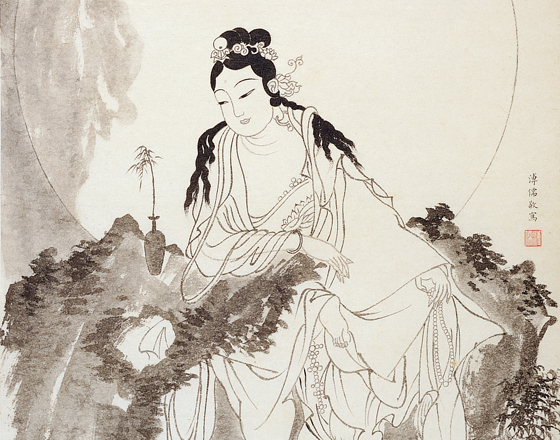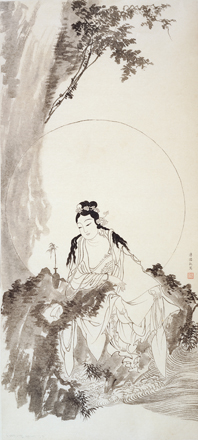 畫中觀音造型,與賈師古《大士像》一類作品有關。觀音散髮披肩,要在安適的姿態中,寫出觀音的自在容顏。溥心畬此圖的水紋,有圖案化傾向,水紋如雲,將整尊觀音托在空中。