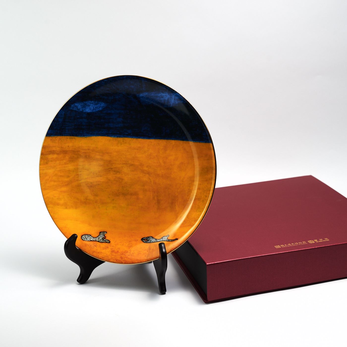 以藍黑色、黃色為主調,展開一神祕的曠野空間,只有兩隻豹,慵懶地臥躺對恃相望,一隻伸長舌頭、一隻伸長四肢,如此閑靜悠然的氣氛,融會於此靜寂的空曠之中,彷彿是來自遠古的聲音,述說著大自然無垠的生命力。