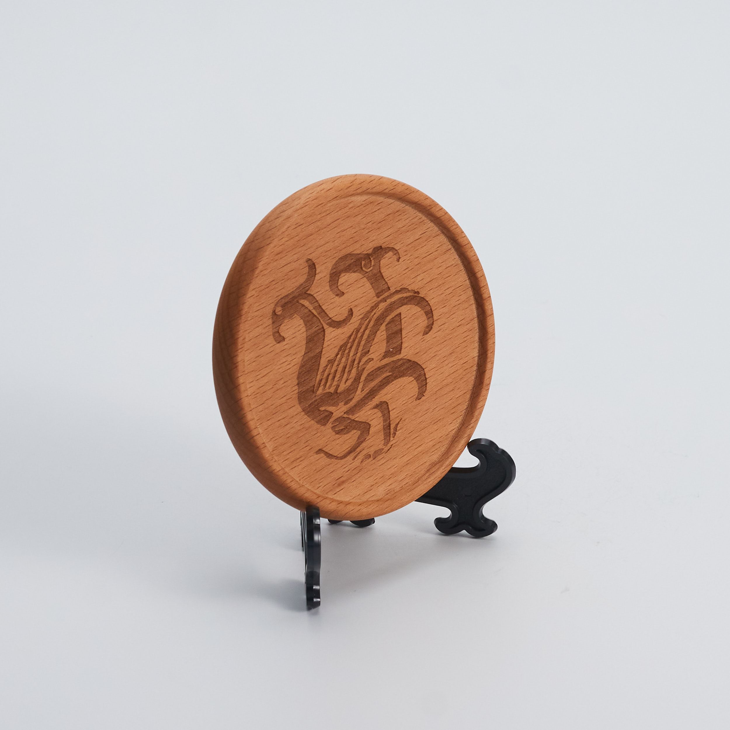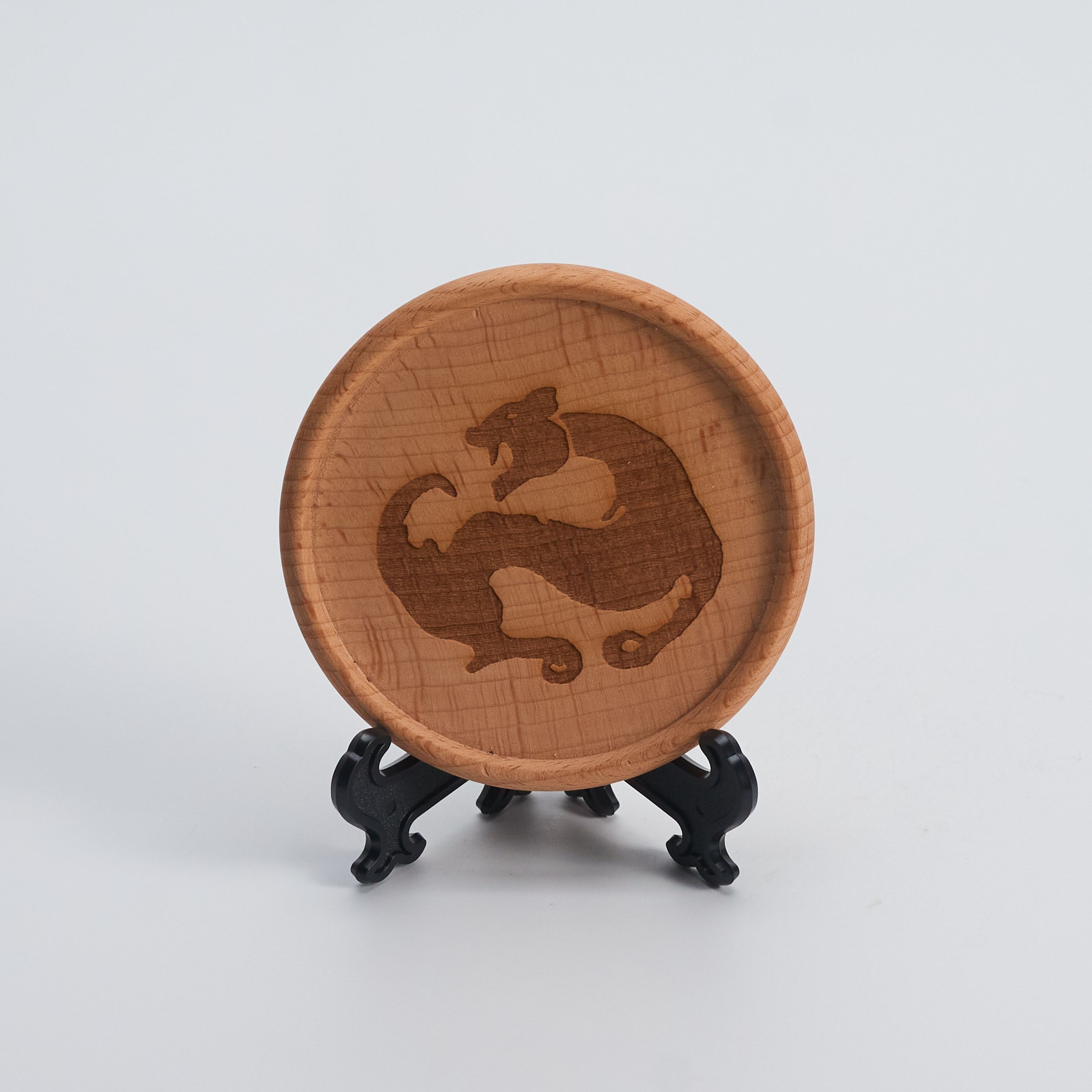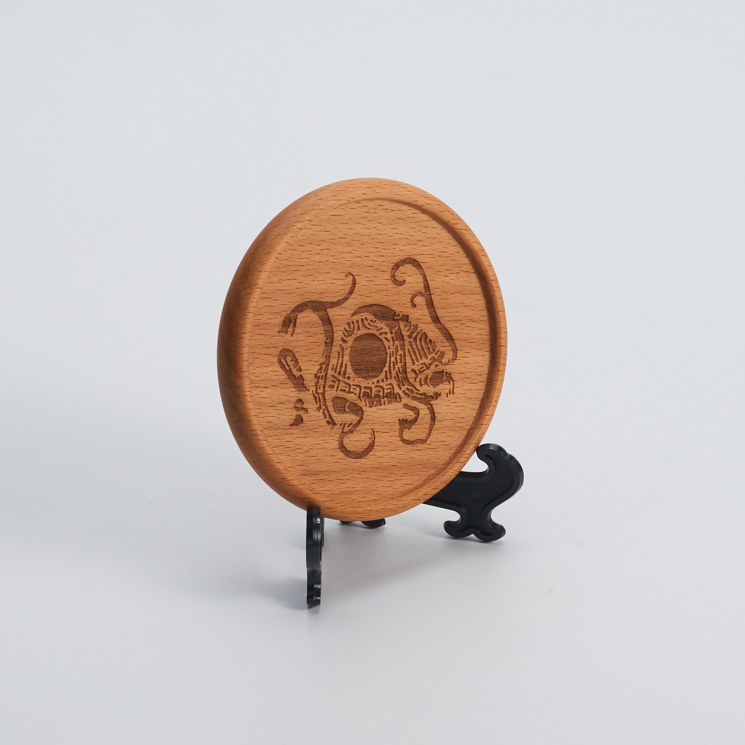 具有特色的木質杯墊,亦可作為桌上擺飾。細膩的線條刻劃出神獸獨特的神韻,每批木材紋理和顏色,皆有細微差異不同,偶有木結均為自然之美。