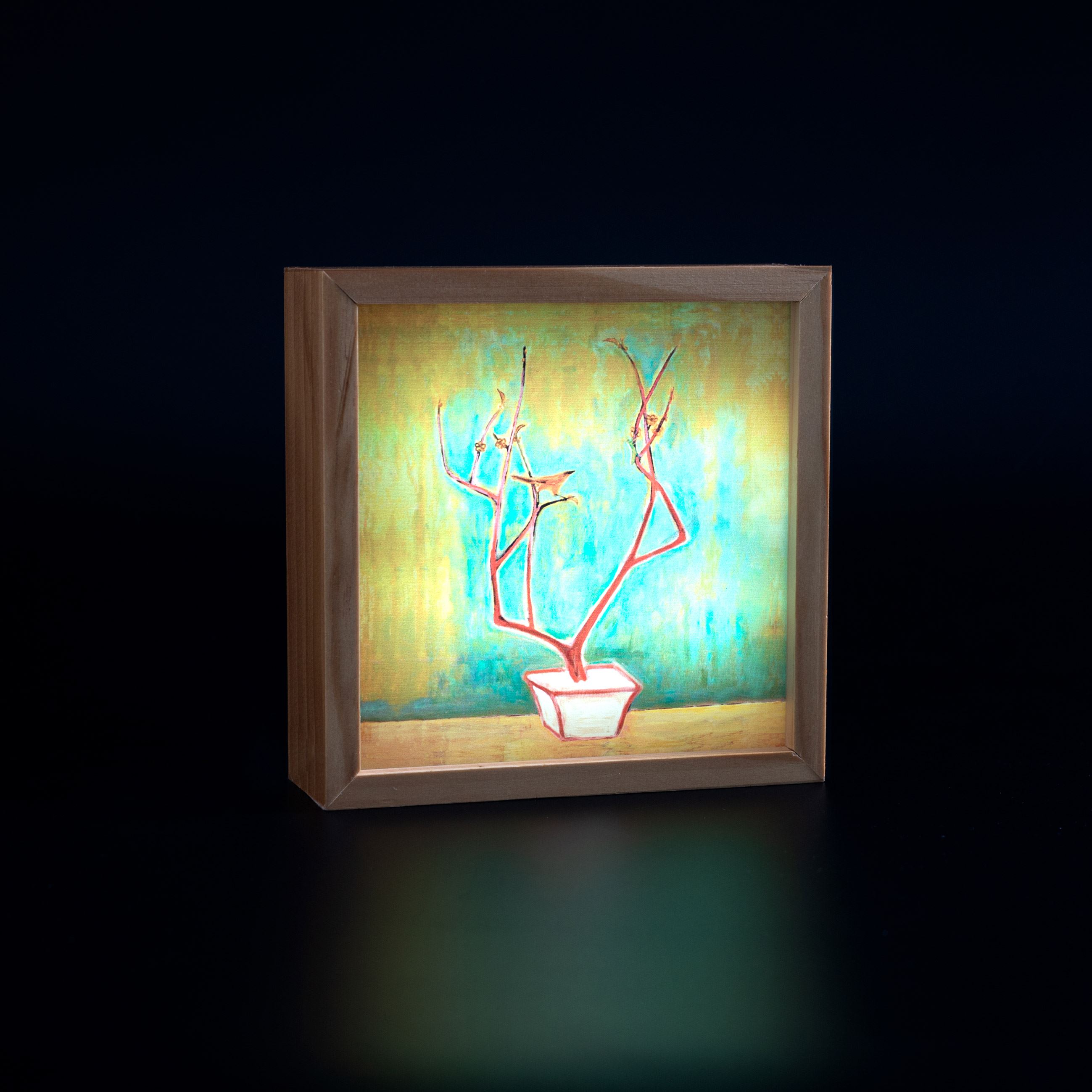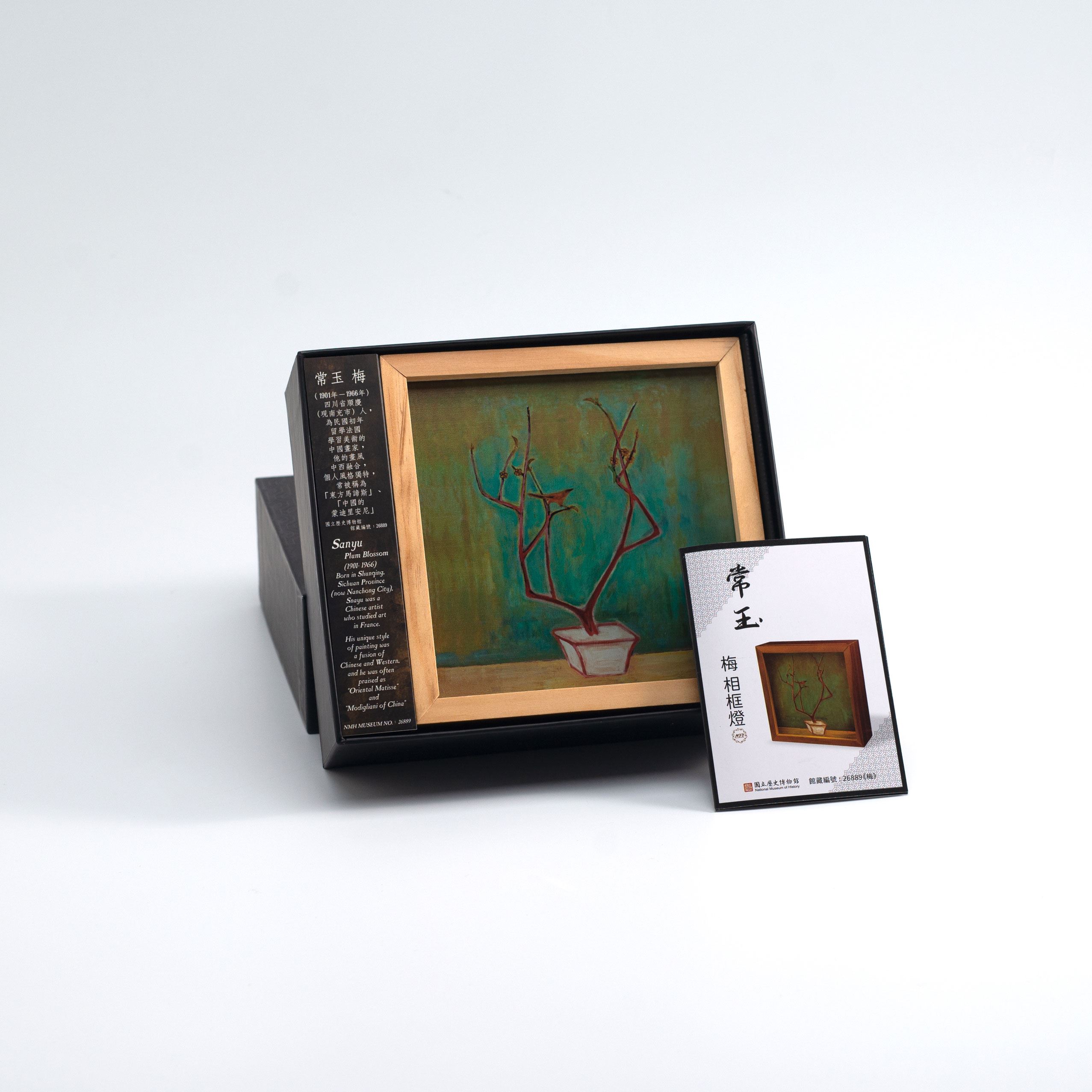 《梅》兼具中國畫作的古樸與西方繪畫的鮮明色彩,利用多層次色彩堆疊出雅致的空間感。鹿角般的枝梗佇立於盆栽之中,使點綴其間的花鳥更顯生動活潑。麥法迪常玉系列商品,取得國立歷史博物館典藏圖像授權,將常玉《梅》,典藏編號26889,如此燴炙人口的畫作融入相框燈之中,尺寸精巧,可隨性布置於家中各角落,增添家中獨特的藝術氣息。