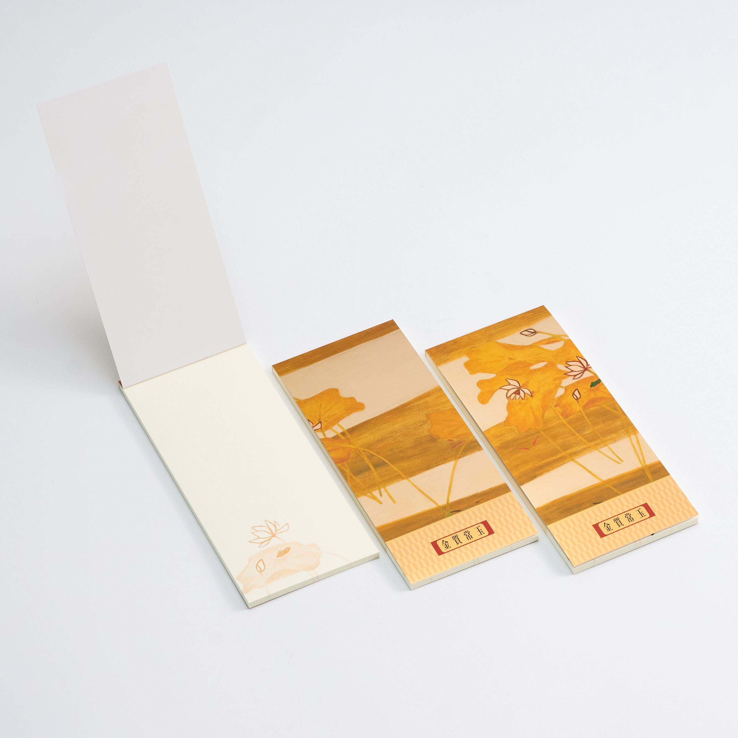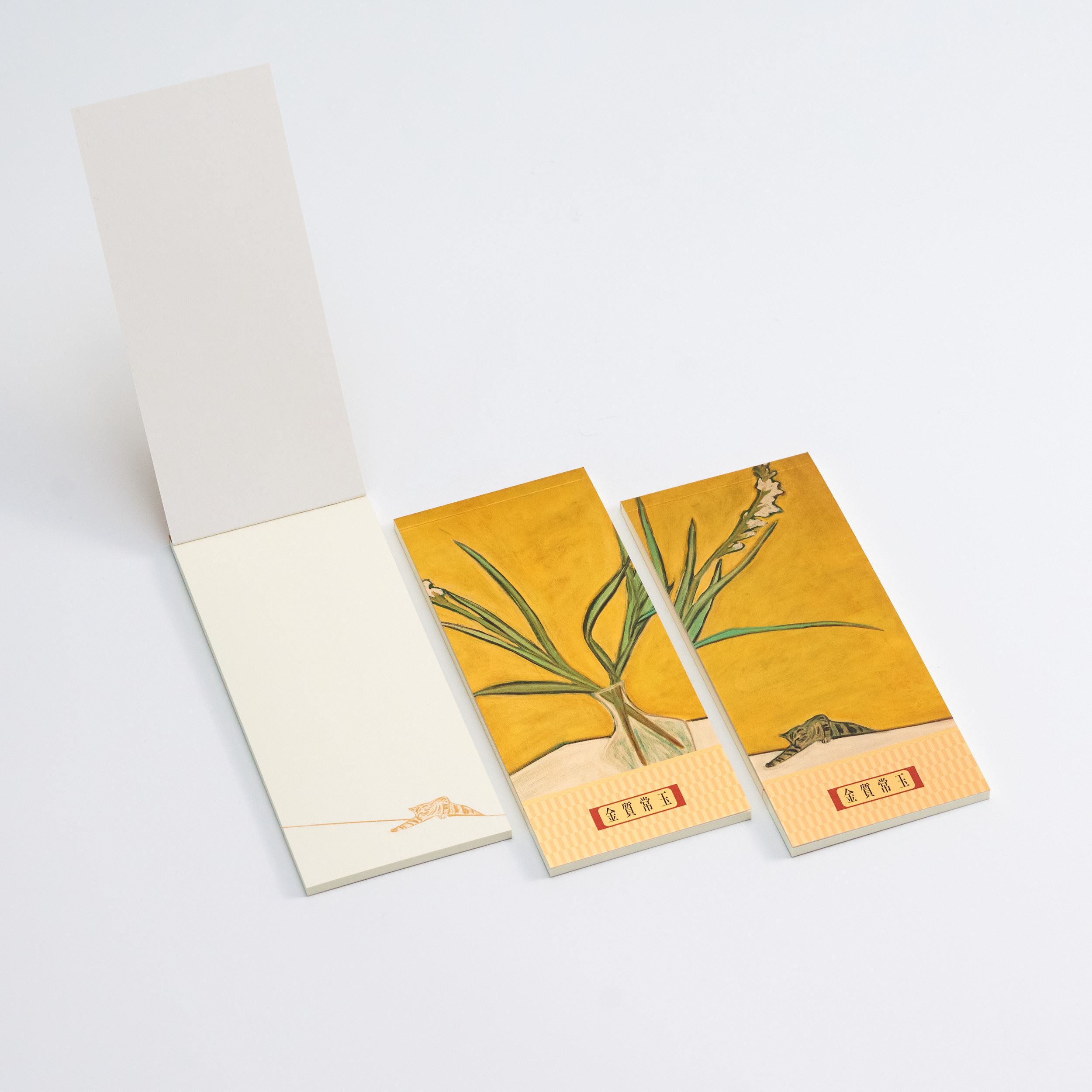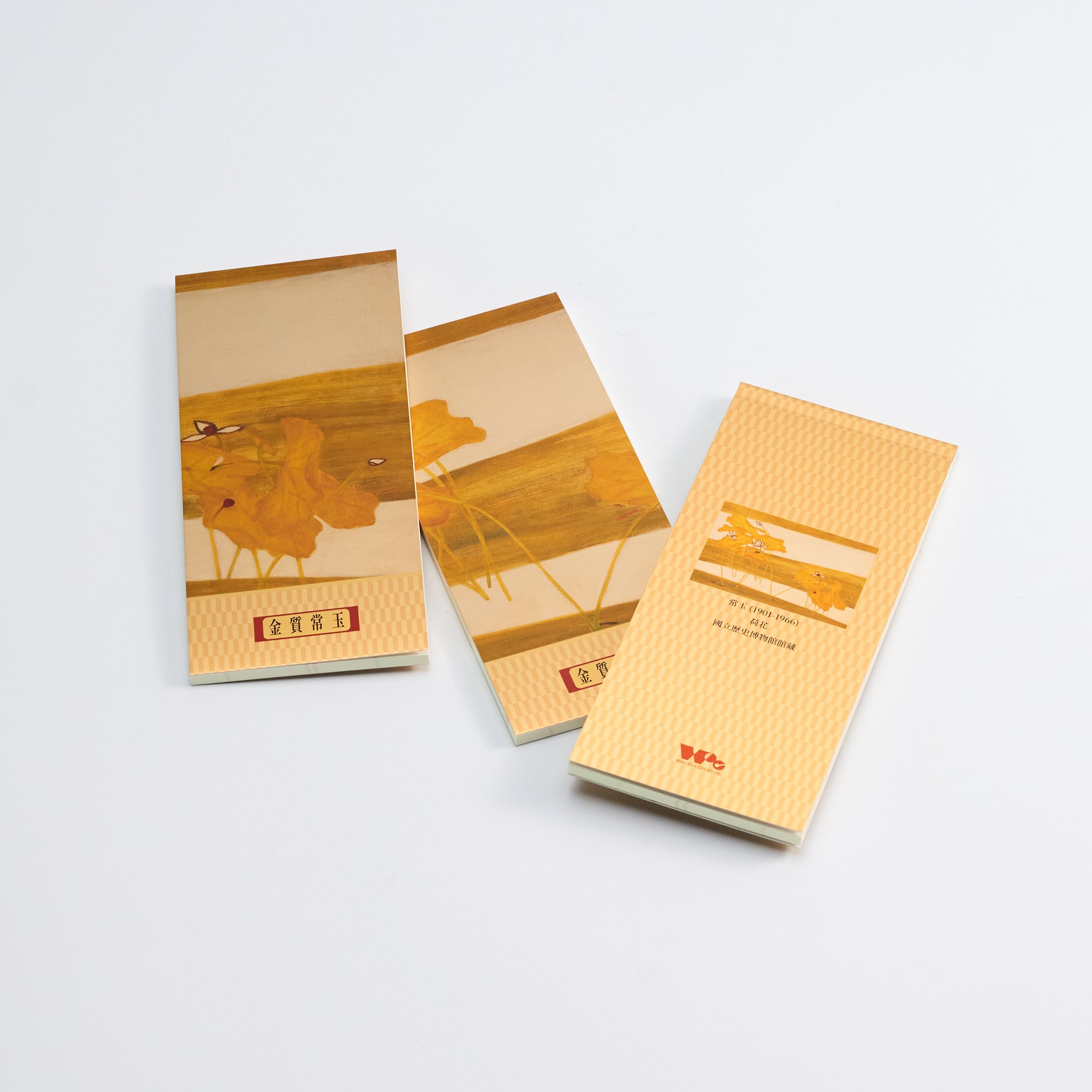 常玉大師的作品顏色飽和,佐以具金屬自然光澤感的紙張做為封面閃亮、吸睛,內頁則採用好寫、滑順的紙張,每頁都以特色印製封面的小截圖,清新可愛。手箋尺寸輕薄,便於攜帶,隨時有靈感,信手拈來就可書寫。三本一套,封面恰好拼接成一幅畫,以黑卡紙盒包裝,更凸顯了霧金的質感。