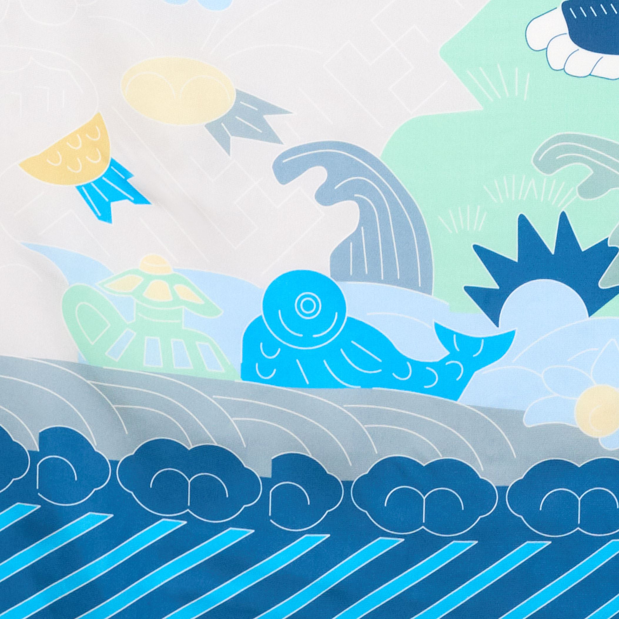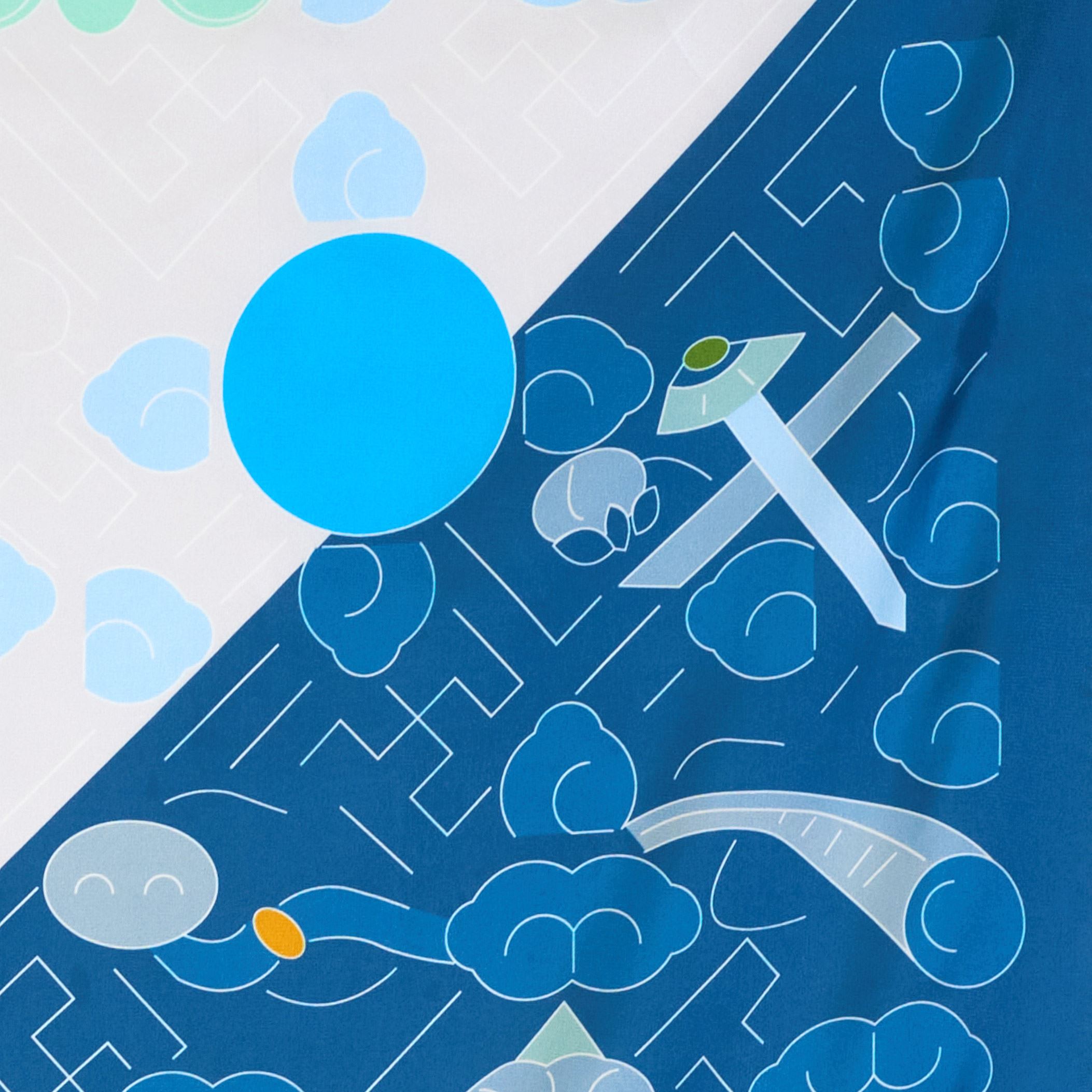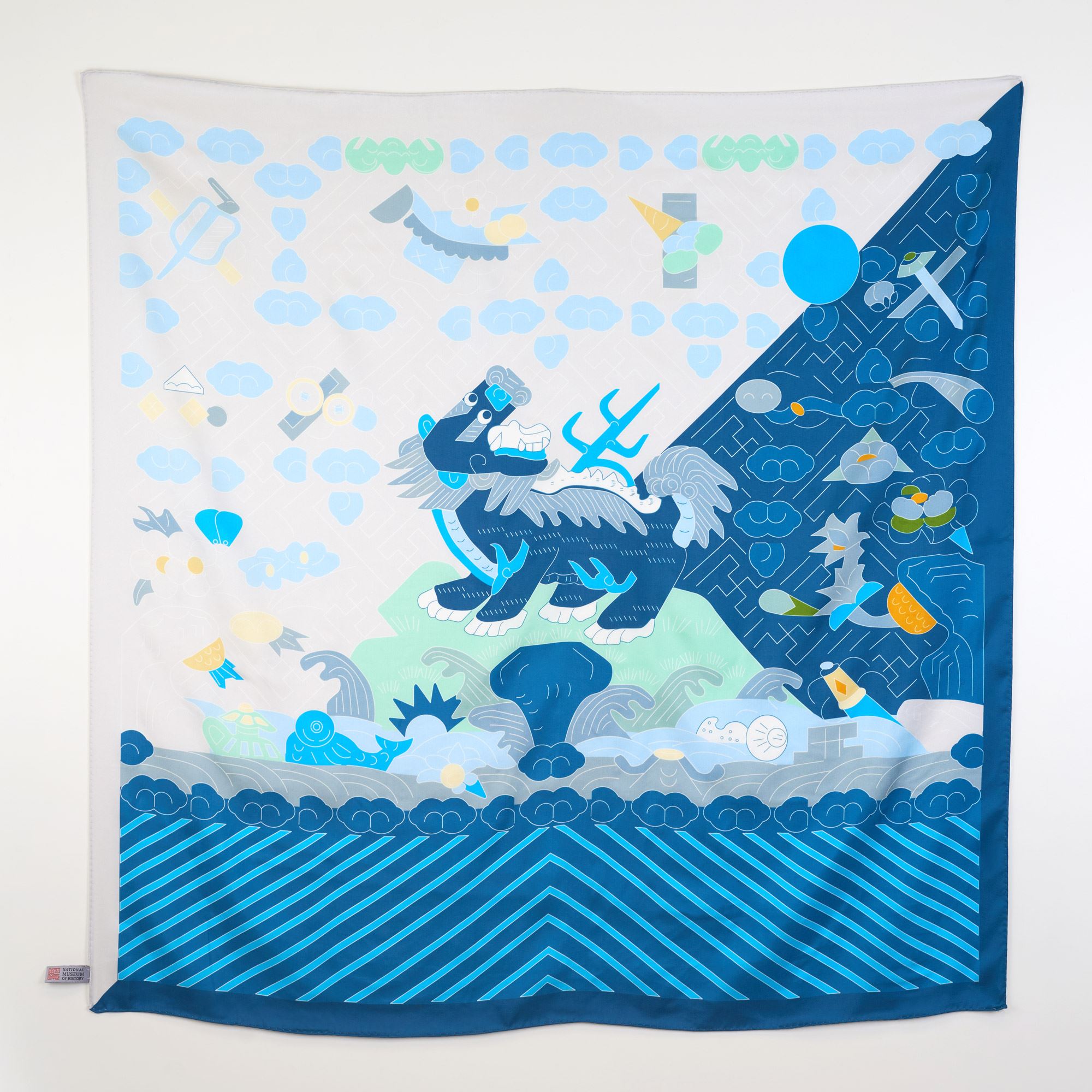 絲巾設計透過科學繪圖的描線重新詮釋,將傳統刺繡的細緻度高規格展現,正中間是回首望日的獅子,背景滿佈卷雲紋及萬字錦,其中穿插著萬字、寶劍、方勝、古錢圖案,下方水波紋雜有魚、寶瓶等圖樣均寓意吉祥,所有線條皆以幾何作為整體架構的骨幹,並從中帶出色澤明暗的層次感、貼近現代人的各種穿搭風格。在分版顏色的製作上多達 15種色調,使薄透的絲巾更顯色與展現透光質地,呈現圖樣最精細的完整度、同時保有色彩的充分飽和,堅持古老的手工技法,達到傳遞歷史感的溫潤效果。絲巾禮盒包裝簡單精緻,將館藏歷史文物變身為帶有現代感又新潮時髦的穿搭配件。