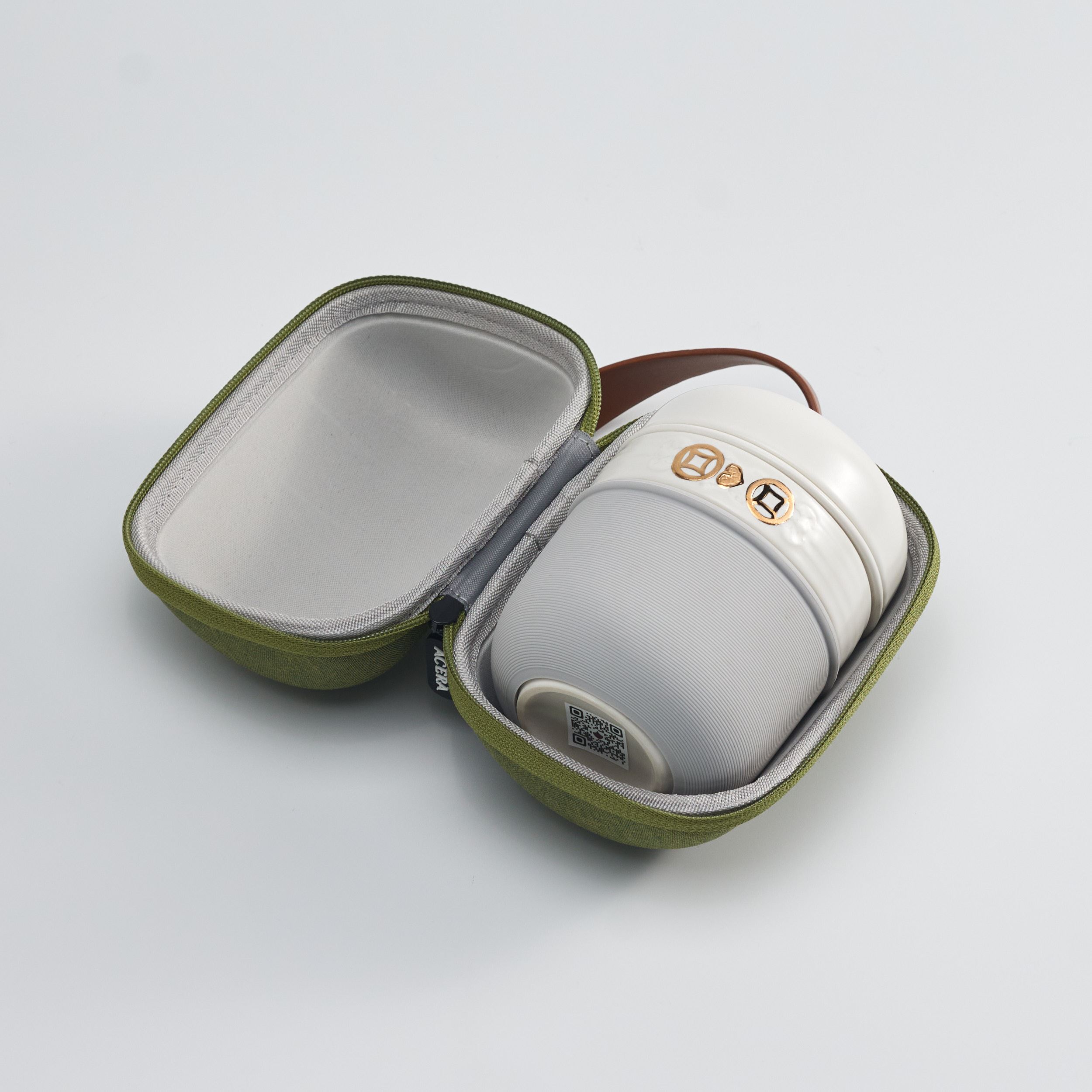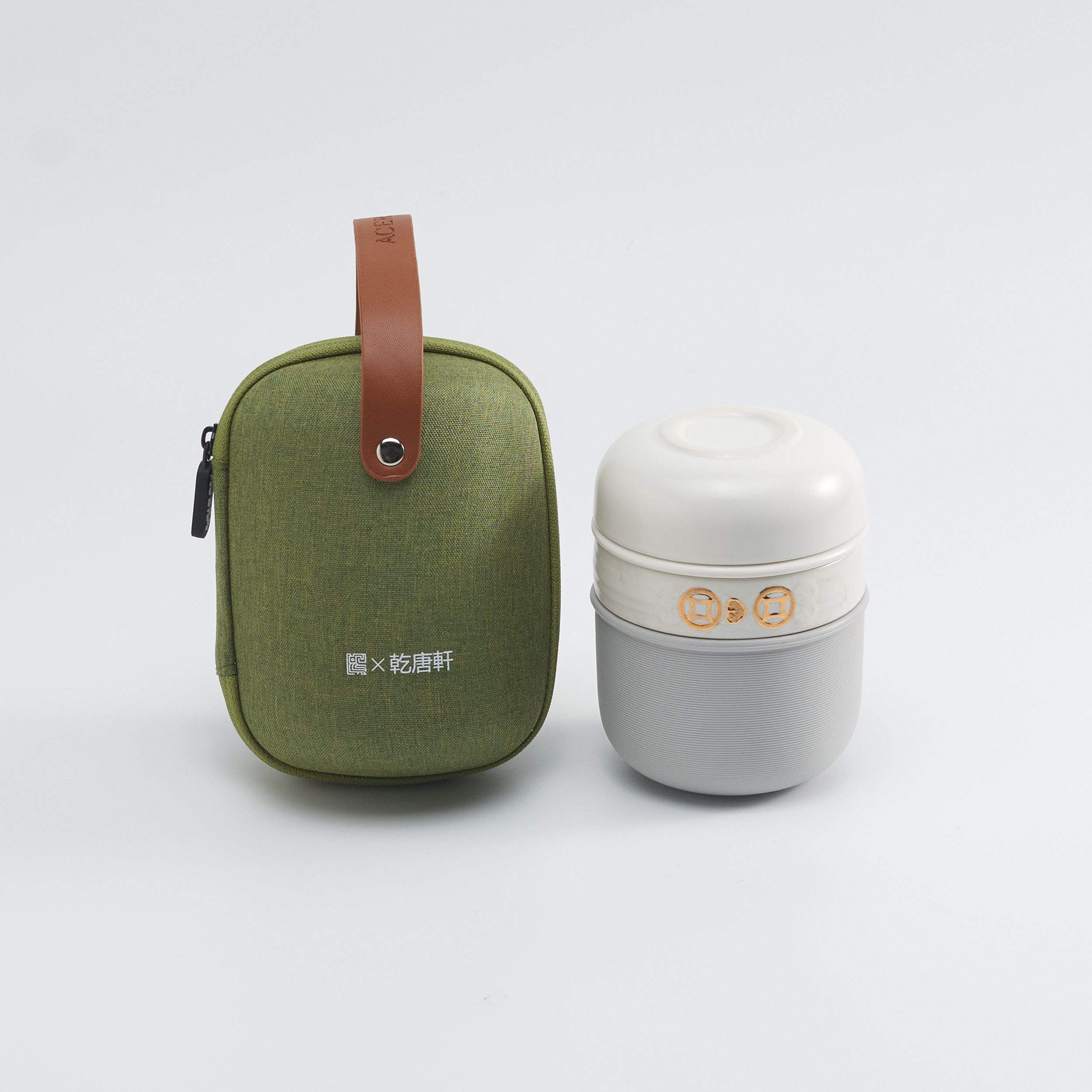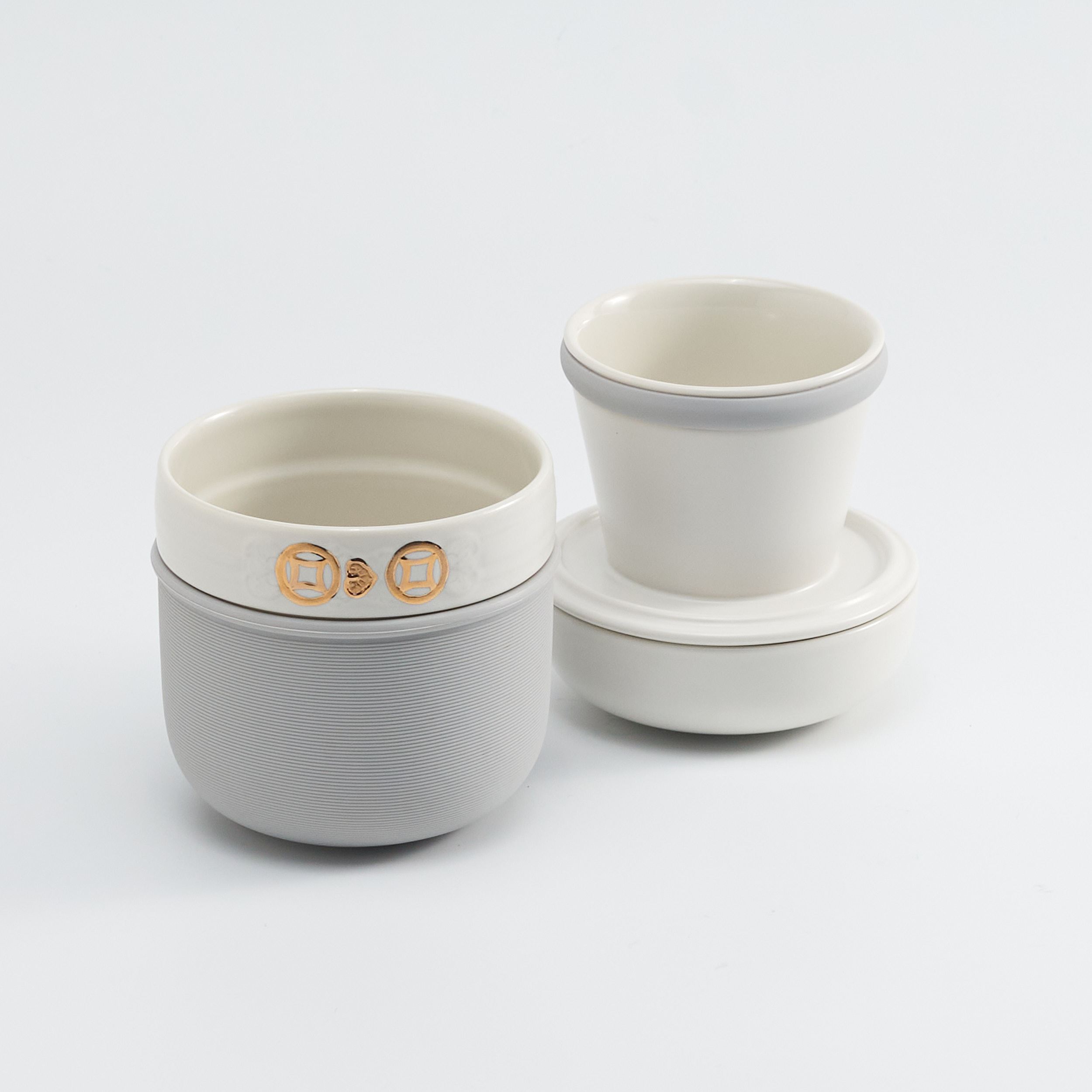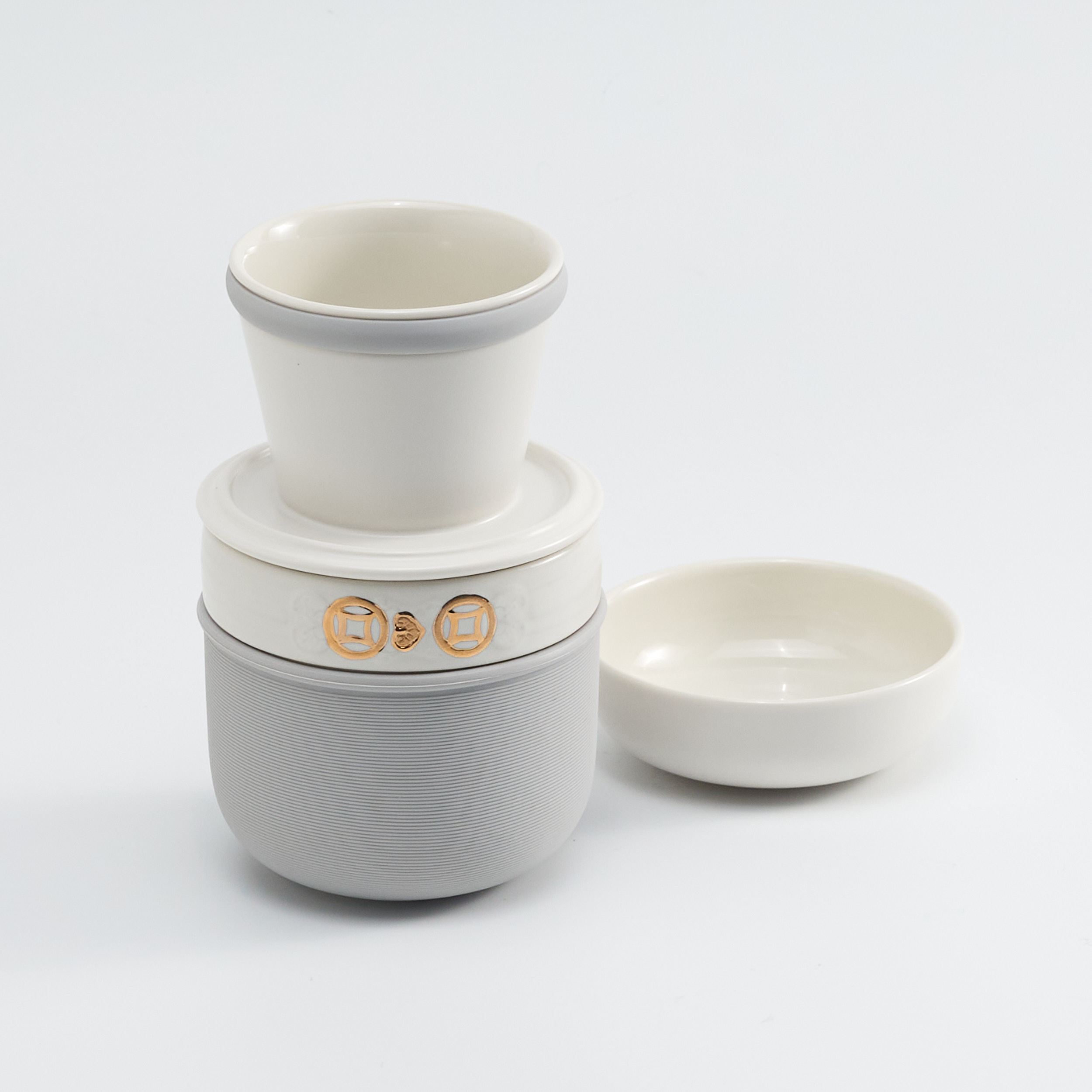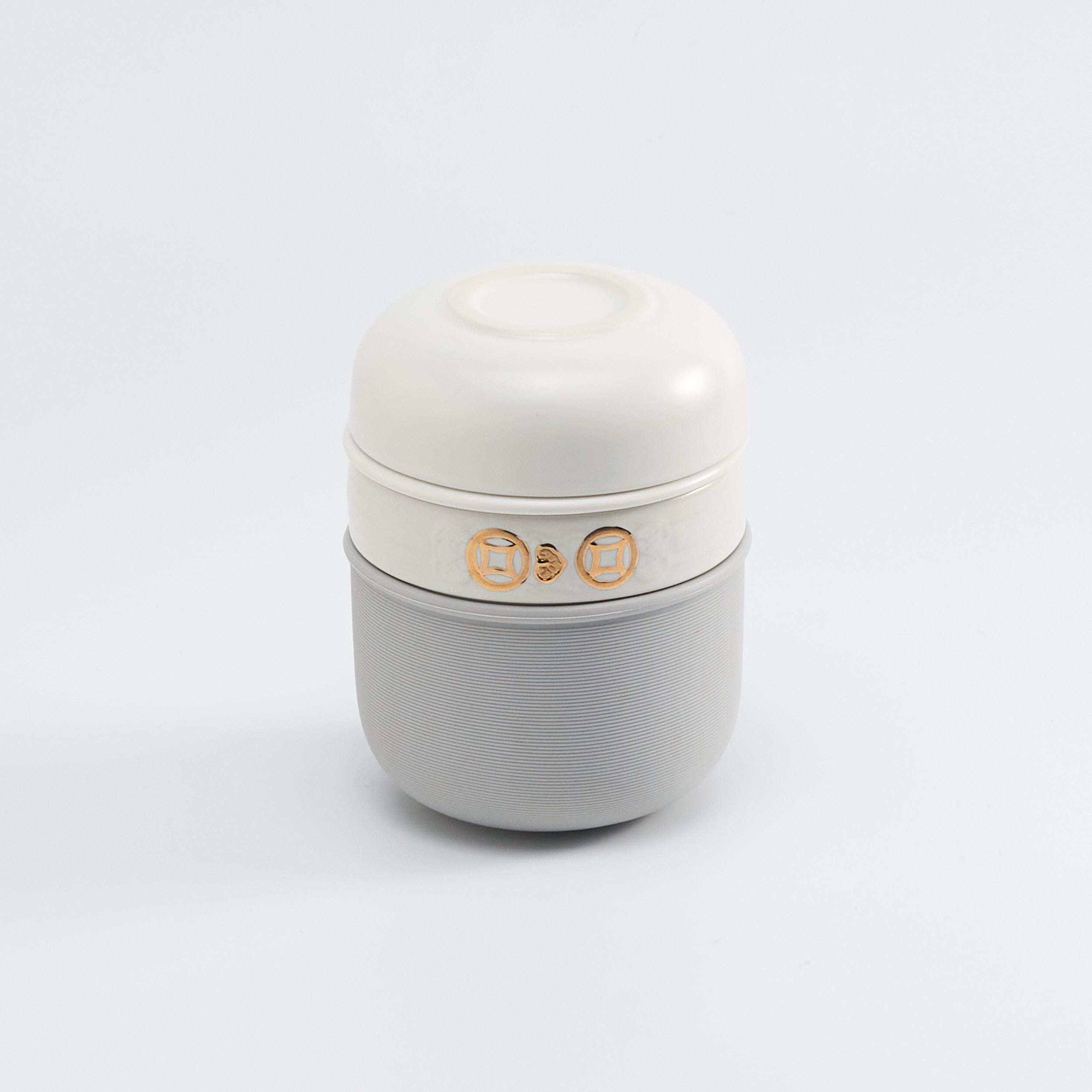 運用國立歷史博物館館藏銅胎掐絲琺瑯帶首為發想,整體採用如意芭蕉吉祥紋飾及琺瑯帶首結合,周圍芭蕉葉紋寓意順心如意,同心完成大業(大葉),帶首上三連環又意環環相扣,其上面分別又有蝙蝠及牡丹紋飾,則寓意了福氣、富貴環環相扣之意。設計白釉鎏金及粉釉,皆能表現出浮雕之精雕細琢特色,供顧客選。
