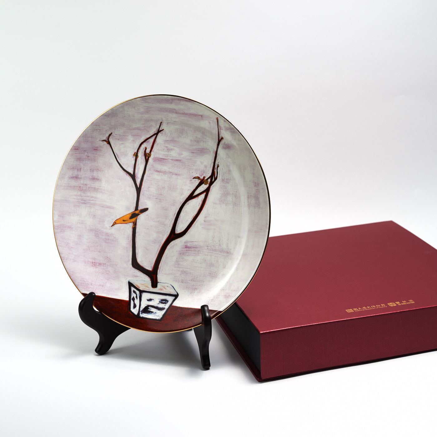 落葉枯枝的盆景上,幾朵梅花與清晰可數的葉片高掛樹梢,一隻黃黑色孤鳥向下觀望,