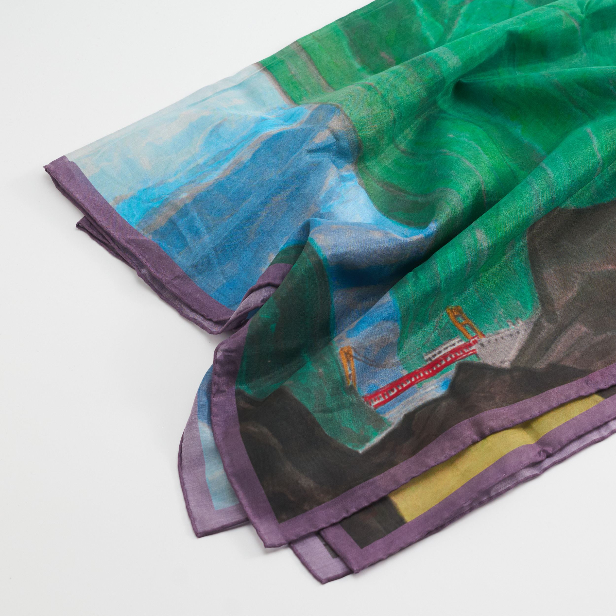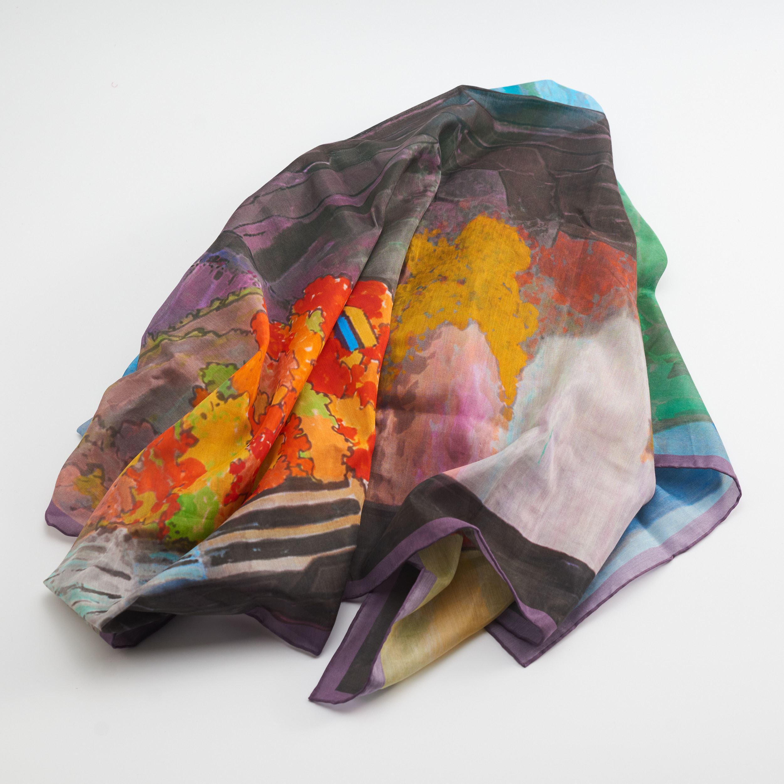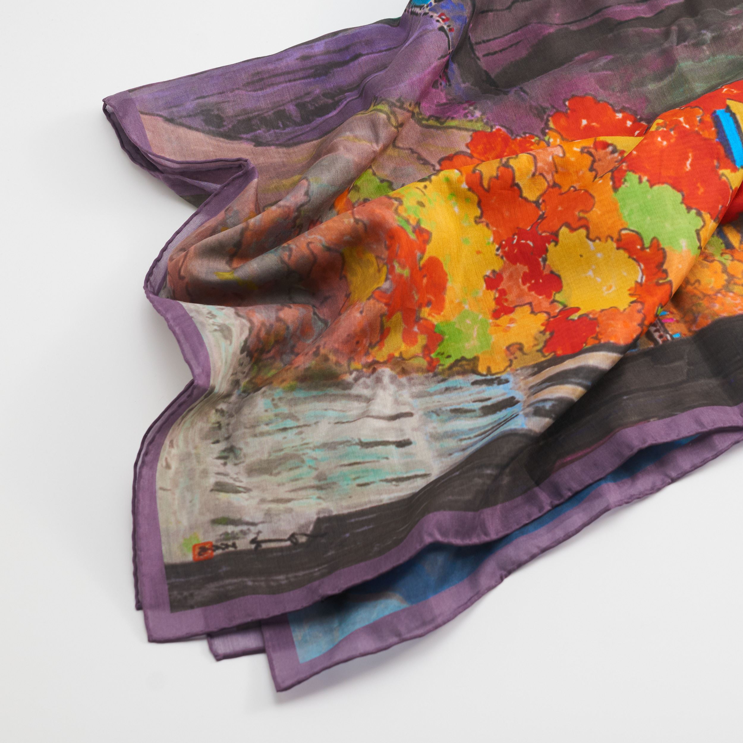 這款絲巾以馬白水的【太魯閣之美(館藏編號:89-00684)】秋日景致部分為靈感。冷暖色調描繪出山水與自然景觀的和諧美景,柔軟的絲質材質帶來極致的舒適感,與細緻的圖案相得益彰,無論是日常佩戴還是特殊場合,皆能完美呈現自然與人文的融合之美。